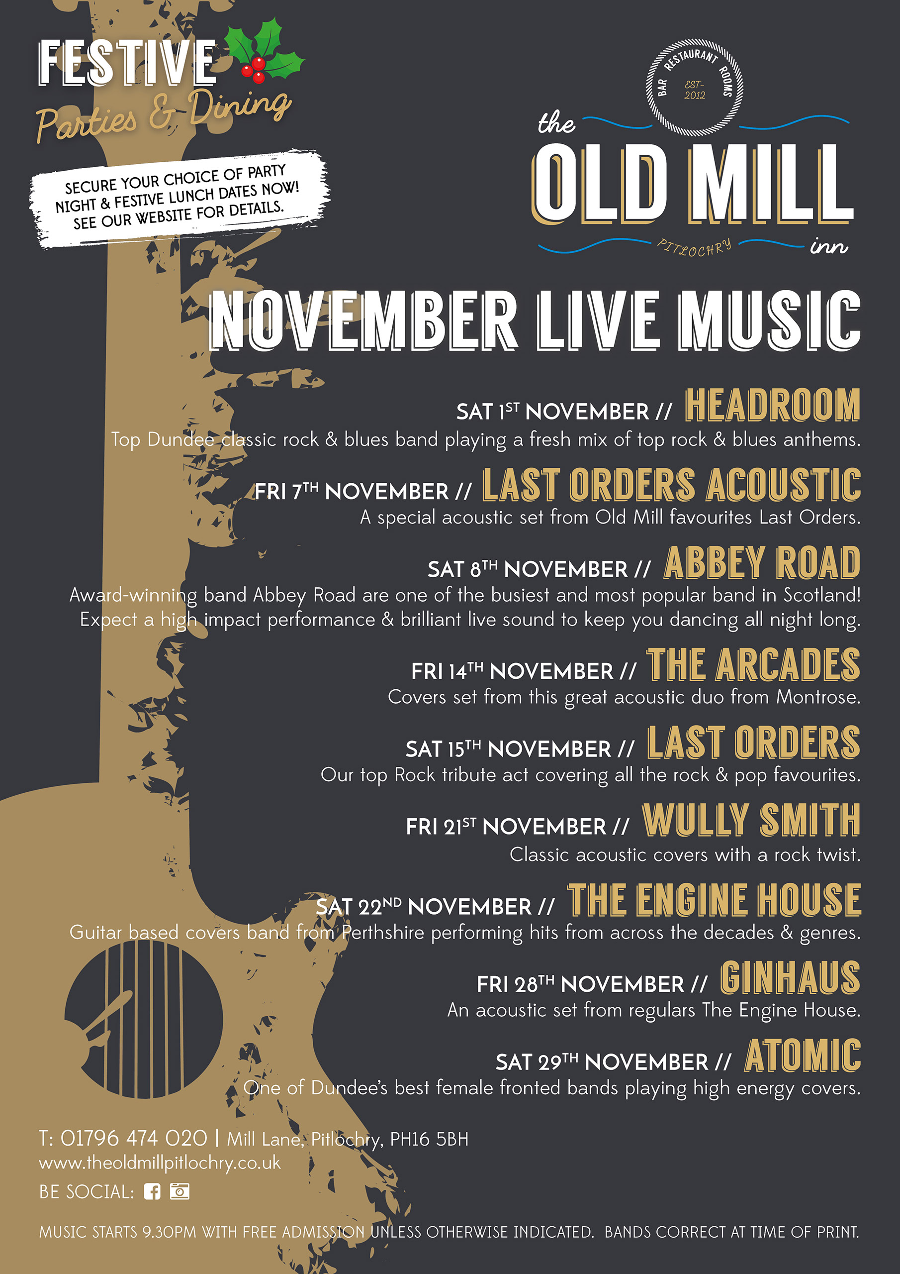 Come and experience the buzz of a big night out at The Old Mill Inn with cracking perfomances from some of Scotland’s top cover bands and local musical talent.  We have live music every Friday & Saturday night throughout the year and all gigs are free entry unless otherwise detailed.  Music generally starts at 9.30PM through until close at 12:00AM.